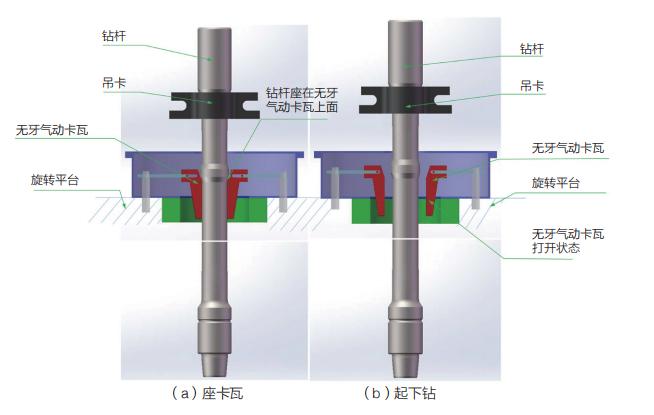 海隆零卡瓦咬傷快速起下鉆鉆桿,是專門為解決起下鉆作業時卡瓦牙咬傷鉆桿本體及雙吊卡作業效率低,勞動強度大等問題而設計開發的一種特殊產品。其特點是在 API 普通鉆桿的基礎上,距內螺紋接頭端面一定位置處增加一個抬肩。在起下鉆時,鉆柱坐在氣動卡瓦上,重力由氣動卡瓦的承載滑塊軸向承載,管體表面無卡瓦咬痕,可有效降低管端刺穿風險。另外,內螺紋接頭上卸扣位置提高,方便上卸扣。